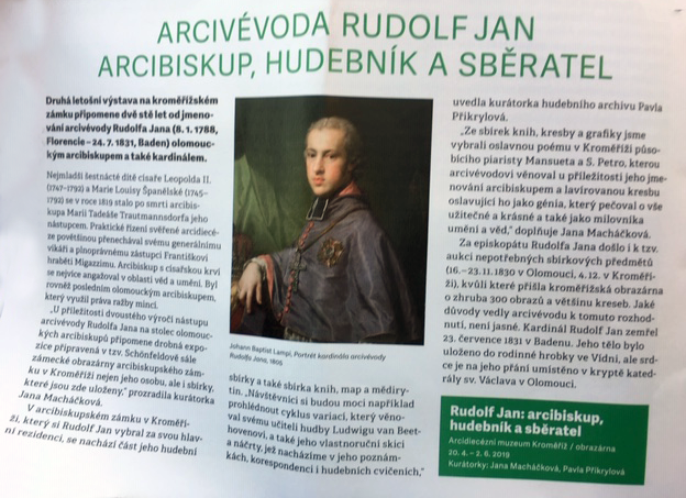 V arcibiskupském zámku v Kroměříži, který si Rudolf Jan vybral za svou hlavní rezidenci, se nachází část jeho hudební sbírky a také sbírka knih, map a mědirytin. Návštěvníci si mohou například prohlédnout cyklus variací, který věnoval svému učiteli hudby Ludwigu van Beethovenovi a také jeho vlastnoruční skici a náčrty, jež nacházíme v jeho poznámkách, korespondenci i hudebních cvičeních.